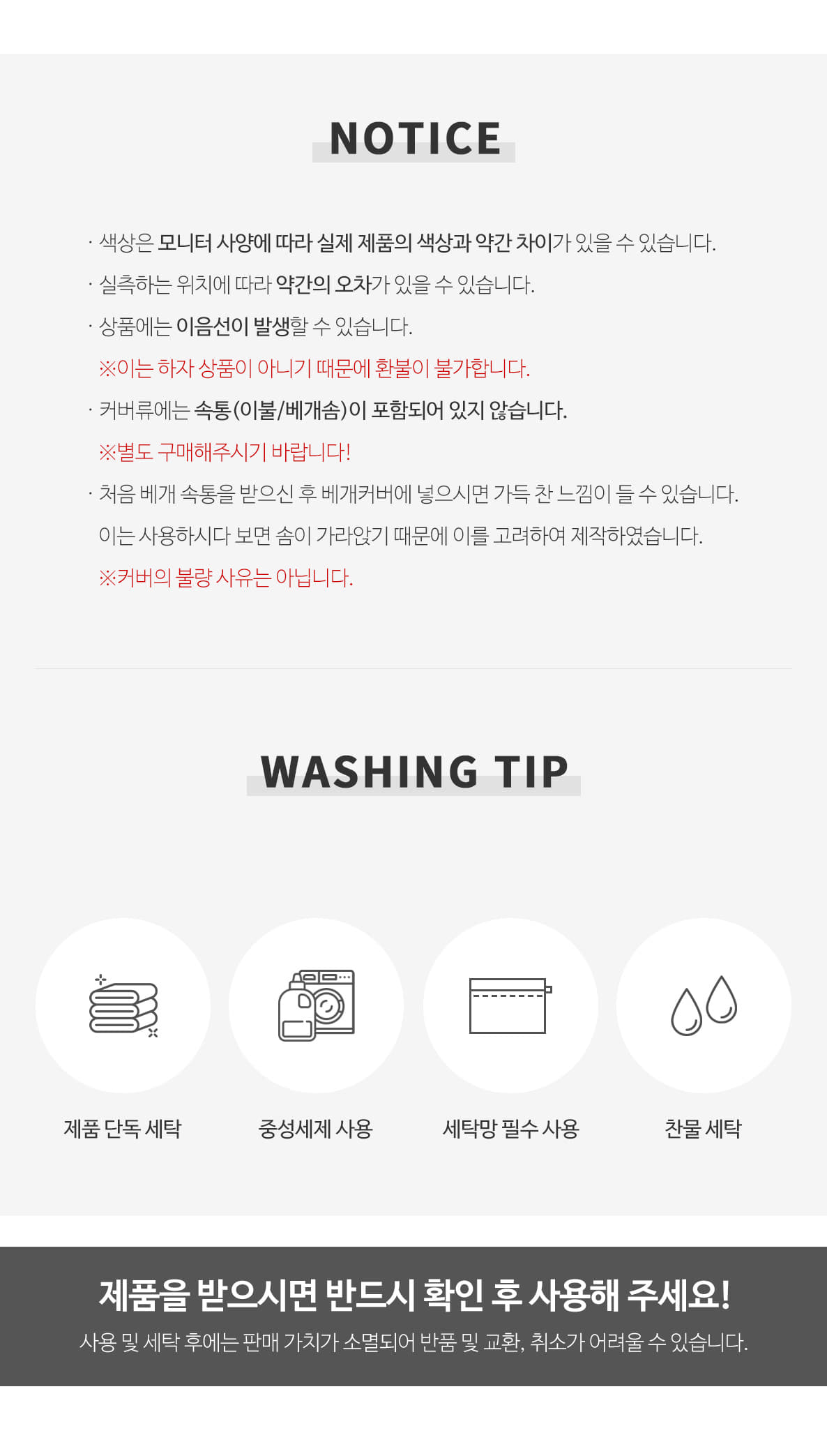 제품을 받으시면 반드시 확인 후 사용요망. 교환및반품은수령일로부터7일이내, 침구특성 상 세탁 및 텍 손상/제거 시 교환/반품이 어려울 수 있습니다.