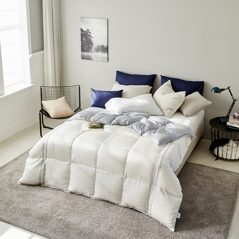 (겉감)면45%,폴리에스터55%, (충전재)거위털100% (솜털70%, 깃털30%) - 헝가리산